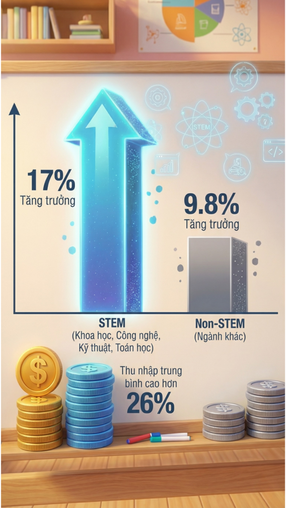 Theo Smithsonian Science Education Center, các công việc liên quan đến STEM đang tăng trưởng với tốc độ 17%, trong khi các ngành nghề khác chỉ tăng khoảng 9,8%. Thu nhập trung bình của lao động STEM cũng cao hơn 26% so với lao động không thuộc khối ngành này.
